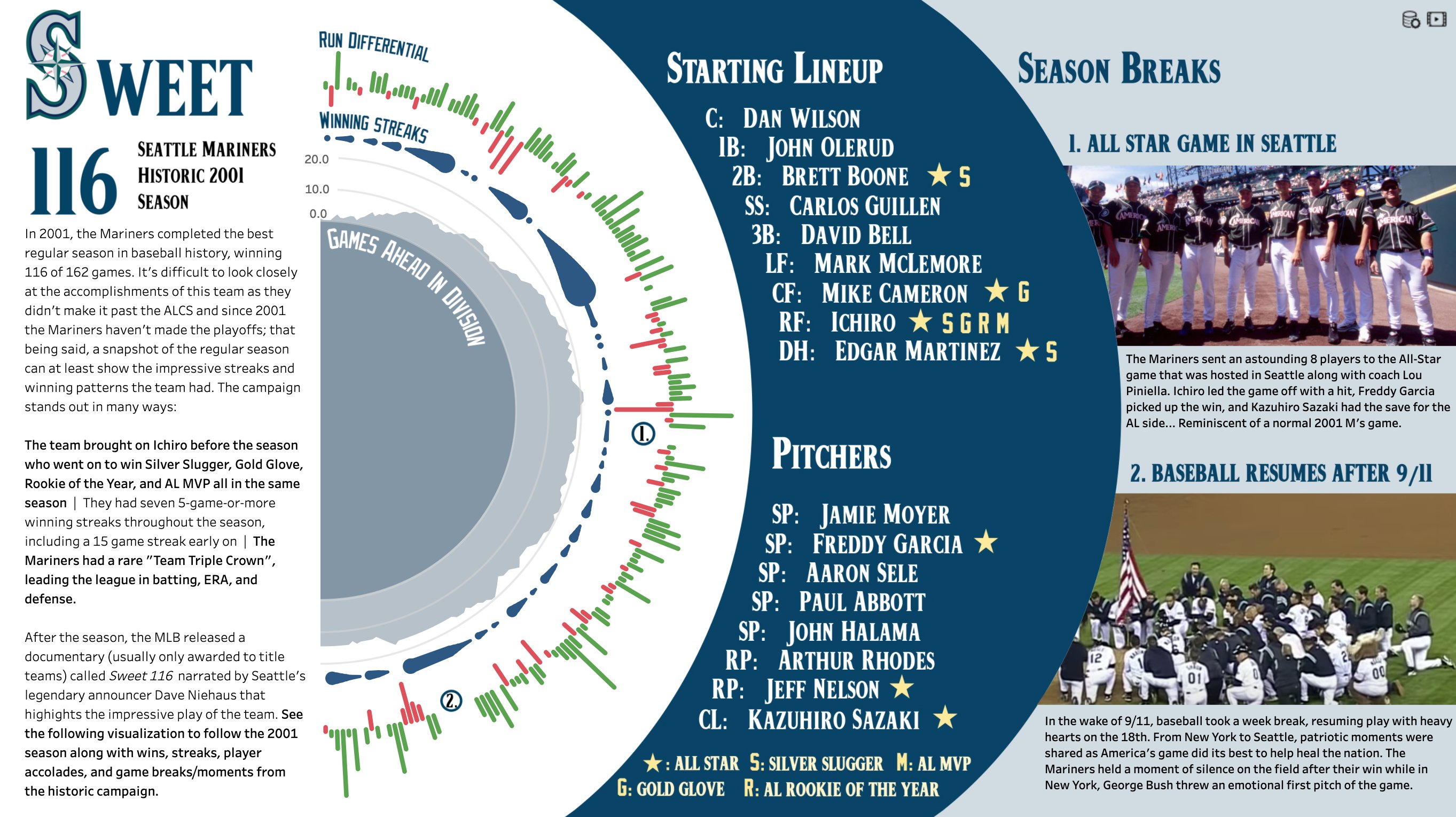 Riley does an awesome job of looking at the historic 116 win season for the Seattle Mariners. I particularly like Rileys design in terms of typeface used as well as background shape colours. It makes for a very good read across the page. Riley's last three vizzes have been super inspiring.