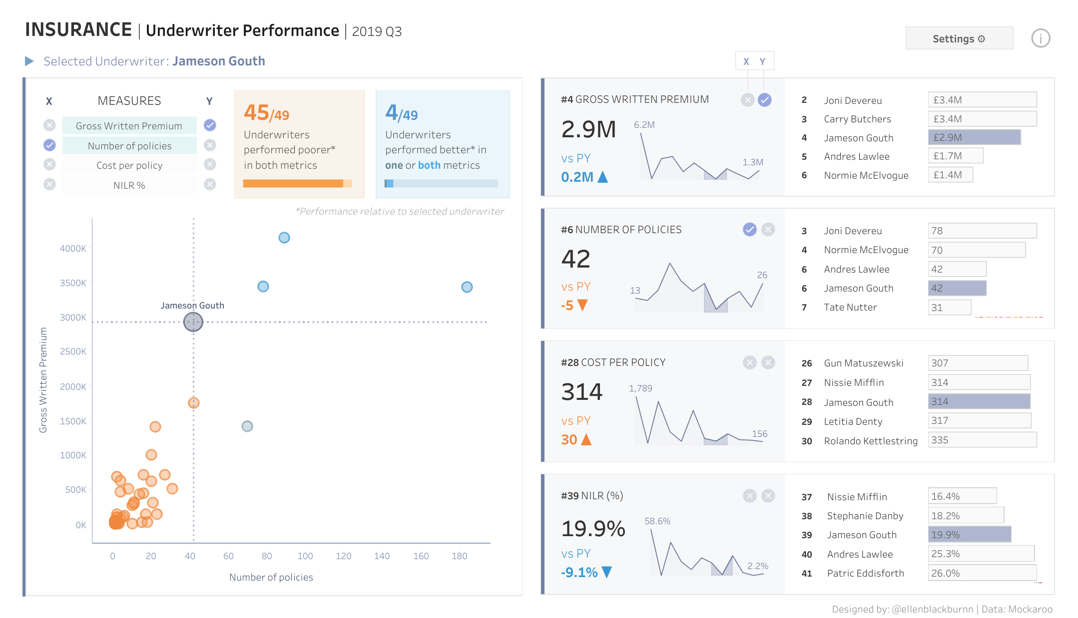 There exist a huge gulf between dashboards designed for Tableau Public and practical dashboards used in a corporate setting. Ellen’s portfolio does an amazing job of bridging that gap by showcasing some of the best business-style dashboards around. What really stood out to me was her mastery of tiled containers and her intuitive use of colours to create uniformity throughout her vizzes.