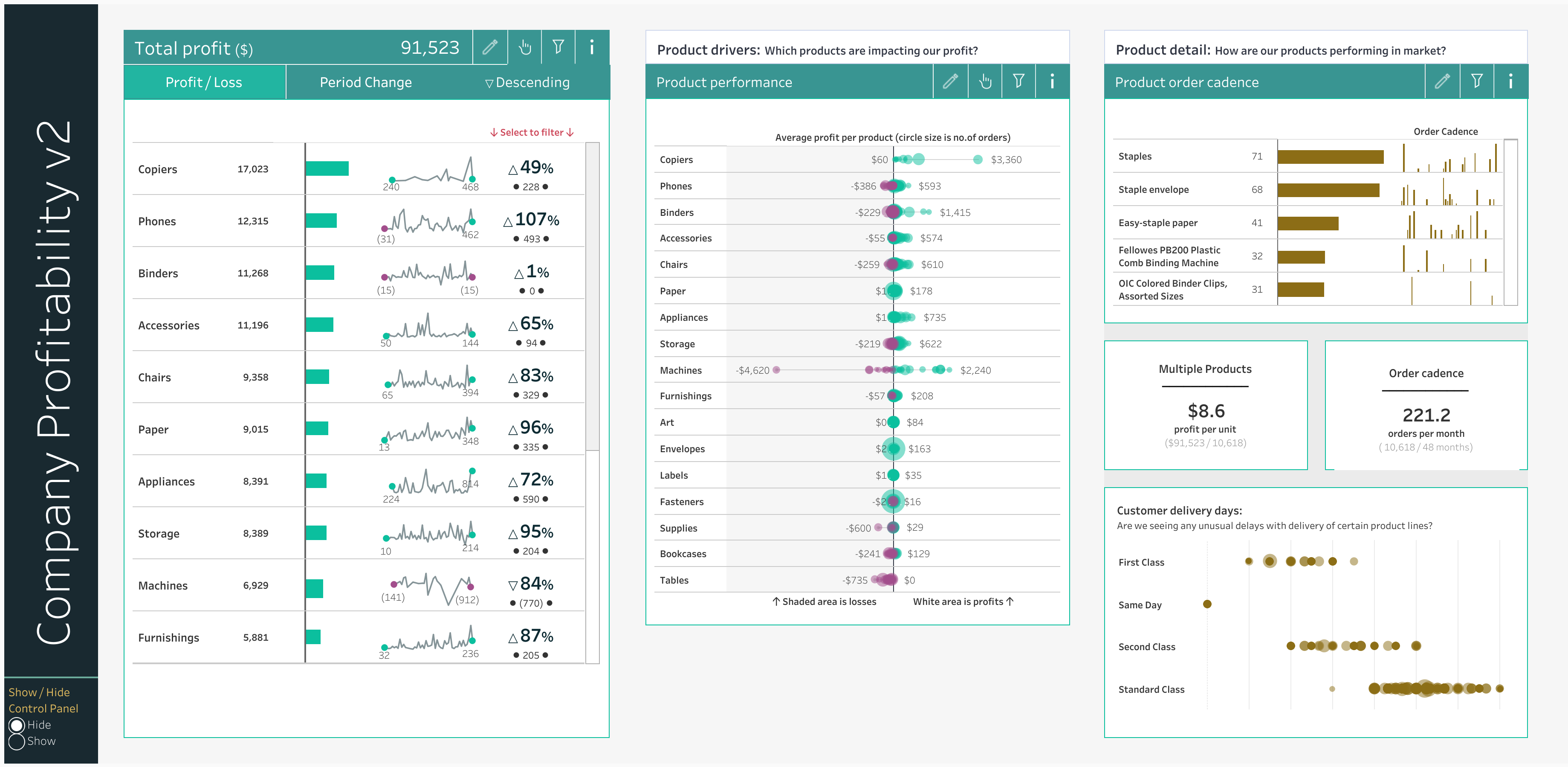Sam: The focus on Business Dashboards was a conscious choice. I had previously put some thoughts down on chart design (Finessing Bar Charts | Tableau Public and 2020.4 Beautiful Business - Pies & Doughnuts Edition | Tableau Public) but I hadn’t tackled any business dashboards outside of my working life. So I set myself a task one day to create one that would include a fully collapsible filter panel (this was before tiled ‘show and hide’ came into the product), I solved that problem in this viz: Collapsible Control Pane | Superstore Insights v2 | Tableau Public – but also in that viz there was something new, that only a select few people noticed! I also ended up creating a single sheet that included a horizontal bar chart, a sparkline chart and a KPI value for each data dimension and was scrollable (vertically) – technically if you think about it, that should not be possible. It’s these problem solving challenges that I love with Business Dashboards – it's being creative, but in a different way to the obvious. Technically business dashboards are a great way to help your personal skill set development. These sorts of challenges force you to think around the problem technically. If you are then able to bring those solutions back into your everyday work easily then great, but even if the solutions are too complicated to deploy, you have still learnt something from the process.