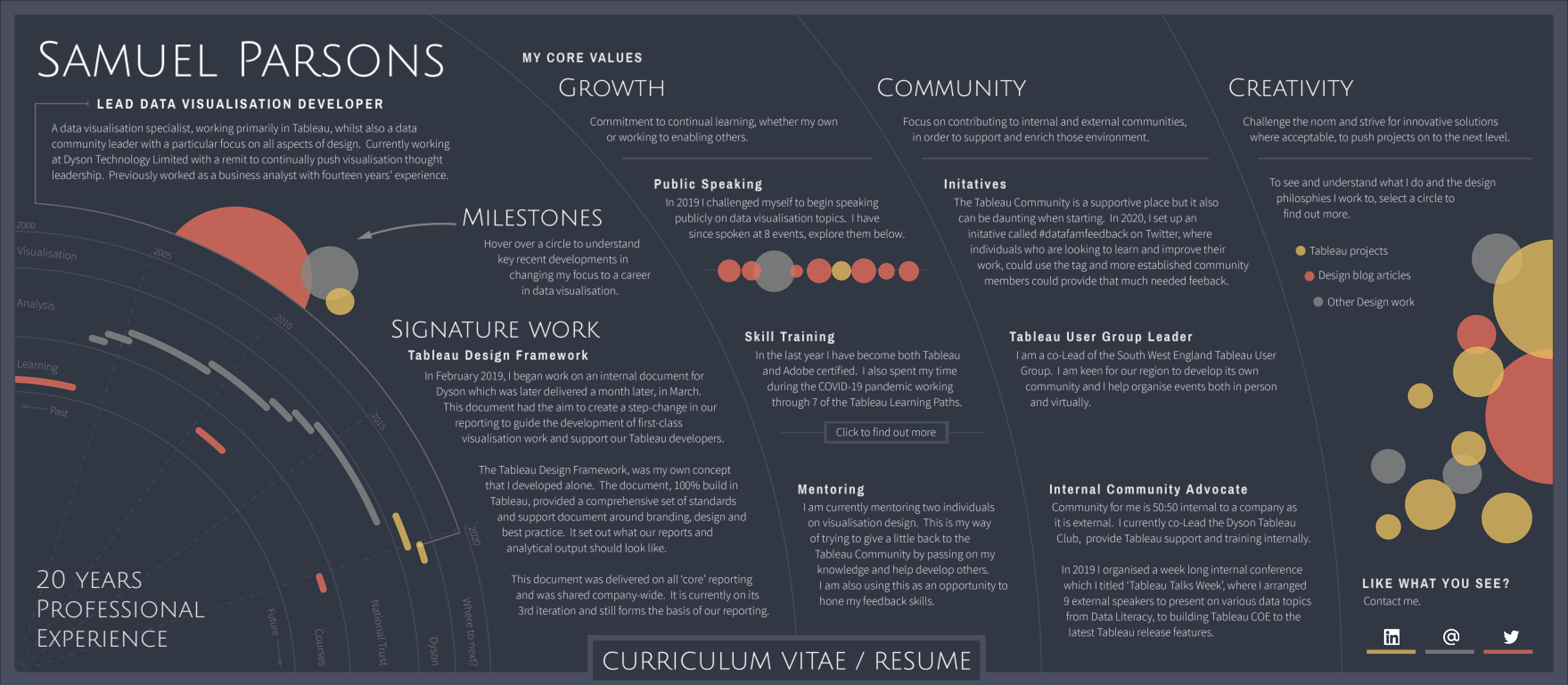 Sam: Thanks CJ – that’s very kind of you to say! As you have gathered I enjoy pushing myself and playing with Tableau. I think as my technical skill set has increased both in Tableau and in other tools I have been keen to keep pushing myself to see what I can achieve. I am very much not a Maths person, I was never great at it, it really through my career has become a necessity to work with – Engineering, Finance, Business Analysis and now Tableau. What I have found is that I am quite brash with my approach, I look at other people’s work and think, “if they can do it surely I can do it too?!” So, I try very hard and don’t let myself be defeated before I start – not to be overawed at the task. The River of Time viz (Rivers of Time | Marvel Studios MCU | #Ironviz 2021 | Tableau Public or the Viz for Social Good viz (#VizForSocialGood- Self Reflection 2017 to 2020 | Tableau Public) are both good examples of this. Technically, I had no idea how to do this when I started, but I forced myself to think around the problem logically. I took the lead from others such as Ludovic Tavernier (Weather Memories) and Luke Stanke (Circular Sankey) and tried to understand their approach and then adapt it to work for me. Logically I knew I could build the maths out a step at a time and that’s what I did. Both of these vizzes were built in stages, when one stage was complete I looked to build on the next level of complexity. For the Rivers of Time it was altering a radial into a double length wave form, into a tilted wave that tapered at one end. For the VFSG, it was building a circular Sankey, then a radial bar at the next level, then the next level Sankey, then another bar, then dots and horizontal lines.