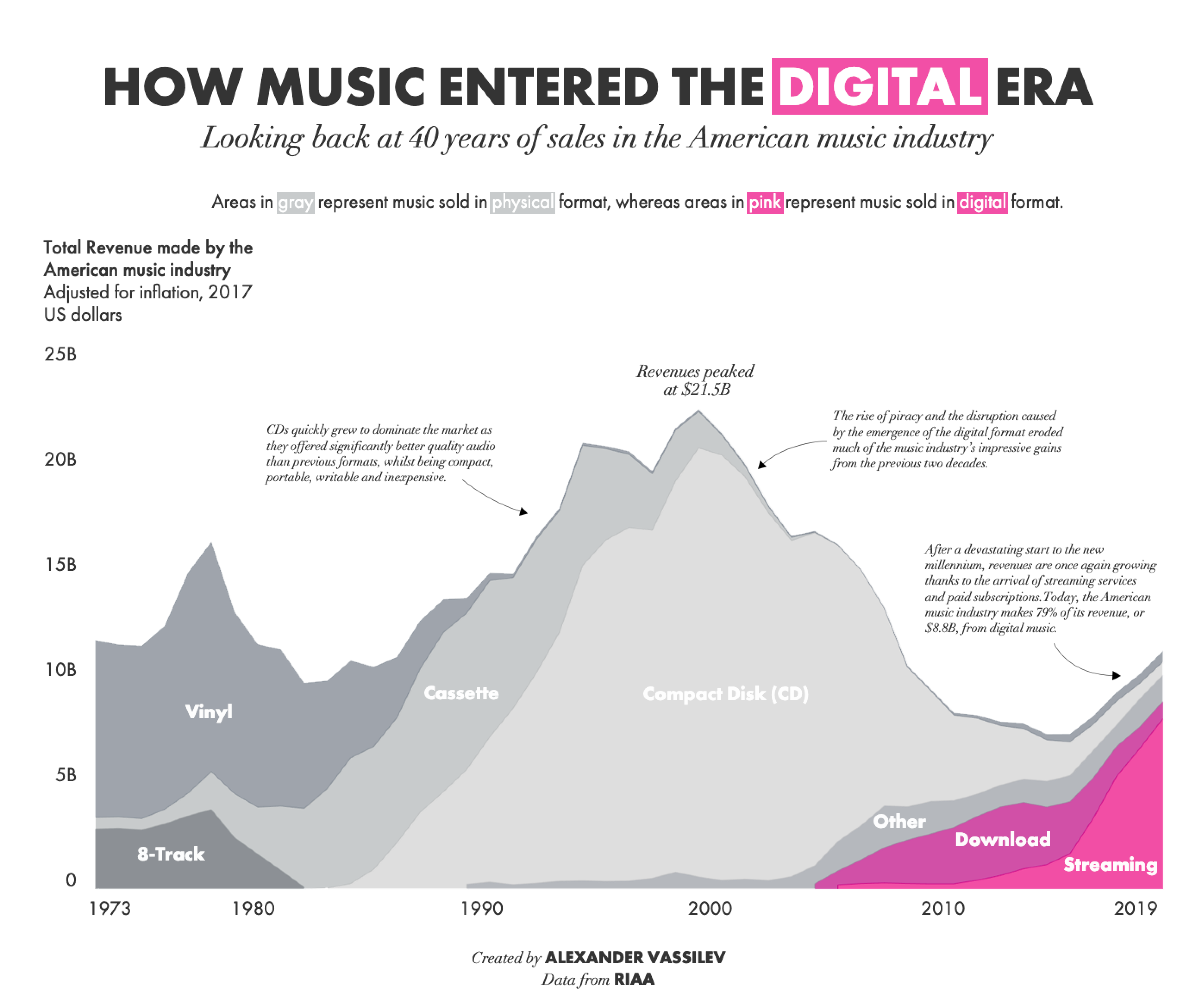 A good example is looking back to Makeover Monday from 2020, week 21 – that week was a very popular week looking at the technology changes within the music industry. There were so many fantastic area charts created that week (e.g. Alexander Vassilev’s - How Music Entered the Digital Era | Tableau Public) , but I wanted to try out a different style, I wanted to try creating a boldly coloured visual and see if I could make them work together well. We are taught that the less colours used the better and to supplement your main colours with shades of grade – this is visual best practice. I wanted to experiment with making something that visually worked but doesn’t stick to the rules (My viz: Tech & Music - #makeovermonday Wk 21 2020 | Tableau Public) , and this leads me nicely into my 2nd point.